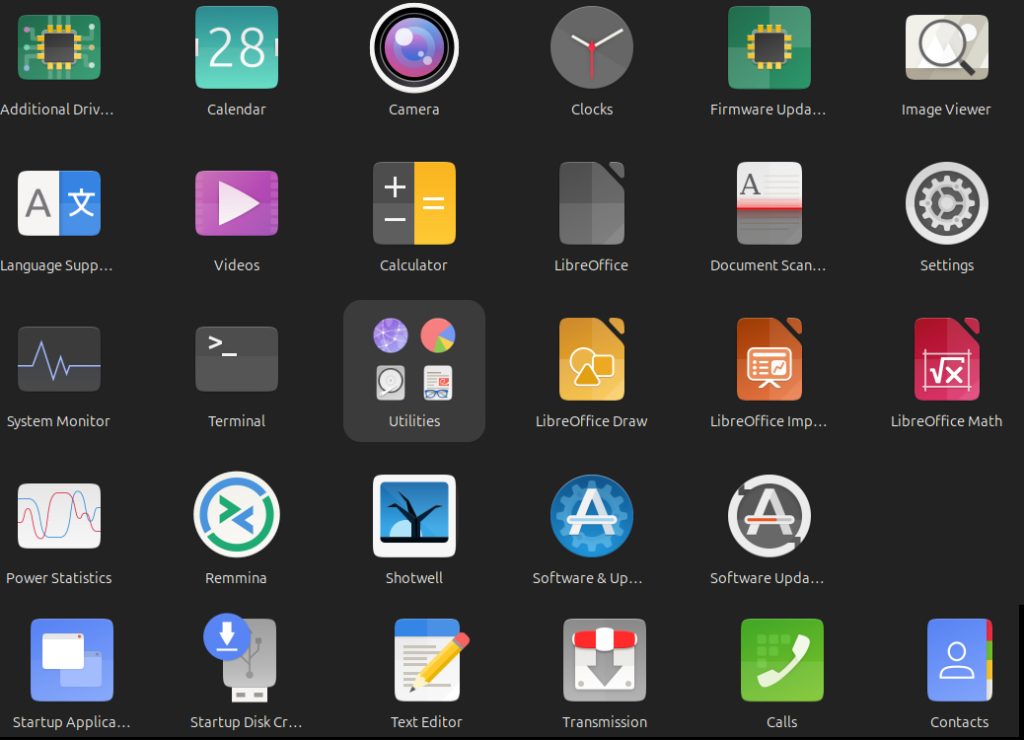1) Google Chrome; 2) Firefox browser; 3) LibreOffice Writer compatible with Microsoft Word; 4) LibreOffice Calc compatible with Microsoft Excel; 5) Thunderbird Mail – if not using web browser; 6) Files – similar to File Explorer; 7) Pinta – image editing; 8) VLC – video and sound player; 9) Rhythmbox – music program; 10) App Center; 11) Help; 12) Backup; 13) ClamTK – antivirus scanner; 14) Trash; and 15) far right corner all the other apps.