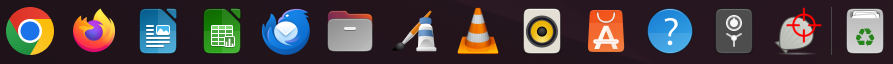 1) Google Chrome; 2) Firefox browser; 3) LibreOffice Writer compatible with Microsoft Word; 4) LibreOffice Calc compatible with Microsoft Excel; 5) Thunderbird Mail – if not using web browser; 6) Files – similar to File Explorer; 7) Pinta – image editing; 8) VLC – video and sound player; 9) Rhythmbox – music program; 10) App Center; 11) Help; 12) Backup; 13) ClamTK – antivirus scanner; 14) Trash; and 15) far right corner all the other apps.